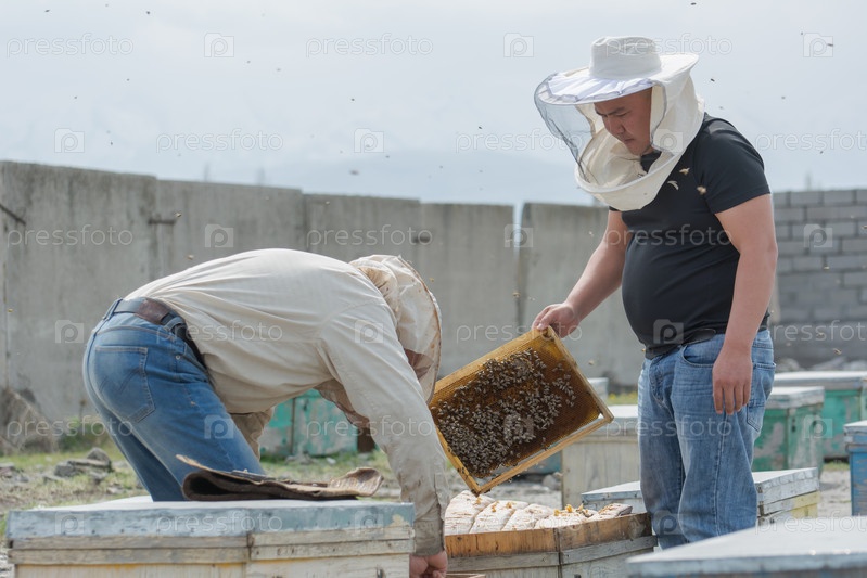 Пчеловодство, мужчина осматривает пчел в ульях