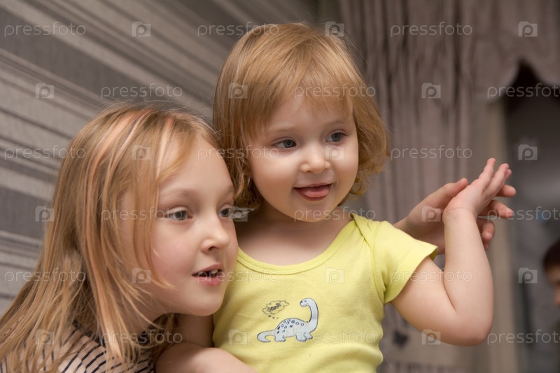 Две сестры сидят рядом, обнимаются, улыбаются и щебечут