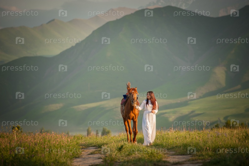 Девушка гуляет на природе с лошадью