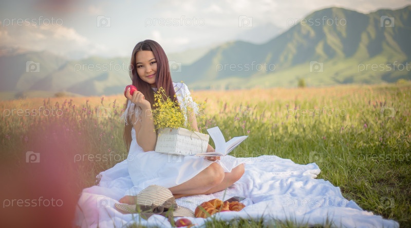 Девушка азиатской национальности, кыргызка, позирует на пикнике в горной местности на природе в белом платье