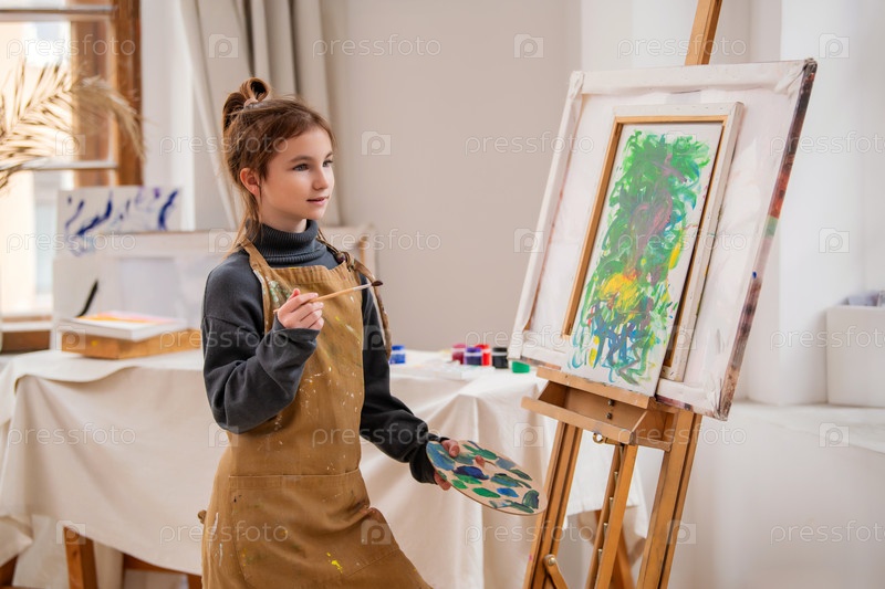 Девушка рисует картину на холсте. На ней фартук, в руке у нее кисть. Картина красочная и живая, с сочетанием зеленых и синих оттенков