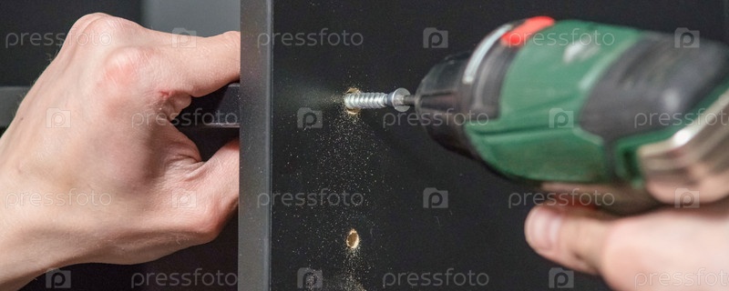 Профессиональная сборка мебели с помощью специального инструмента, крупный план, размытый фон