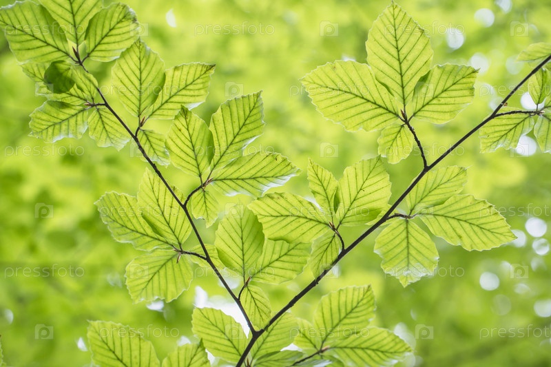 Ветви деревьев с зелеными листьями, вид снизу, размытый фон боке