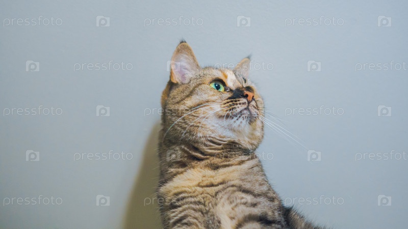 Кот забрался на очень высокое место и выглядит очень довольным, вид снизу