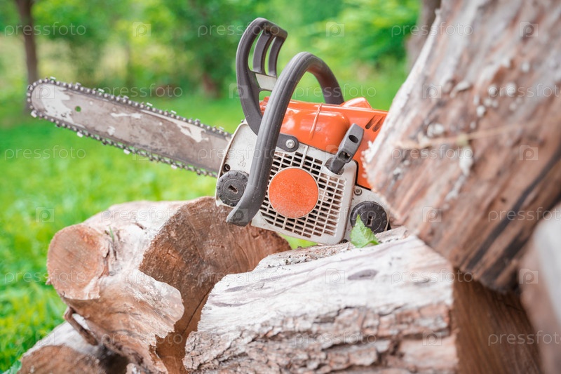 Бензопила лежит на распиленных бревнах среди зелени леса, выборочный фокус размыт фон
