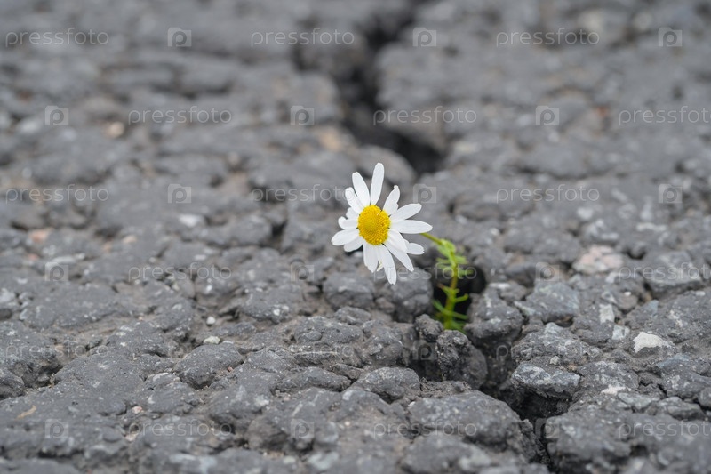 Красивая маргаритка растет сквозь трещину в асфальте