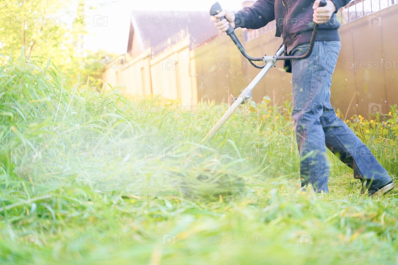 Мужчина косит траву триммером, фокусируется на размытом фоне переднего плана