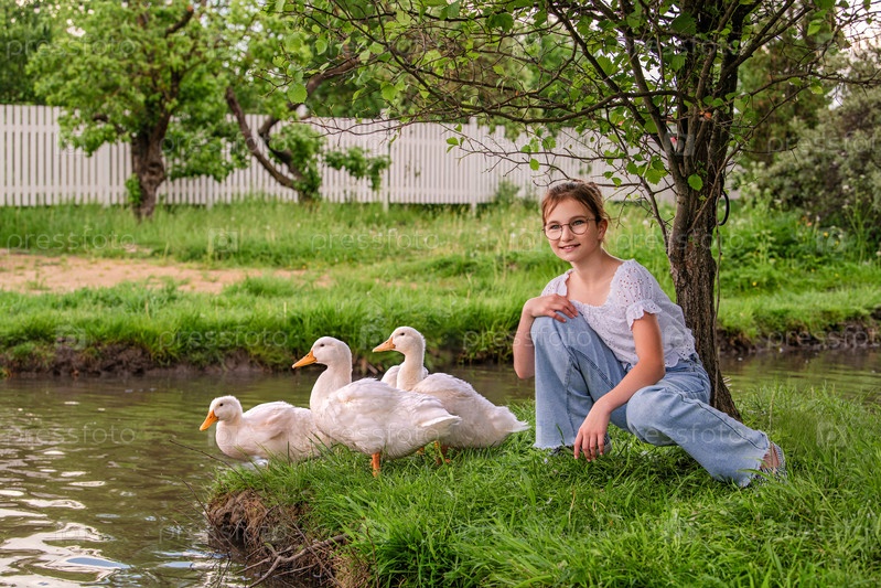 Девушка ухаживает за гусями на птичьем дворе в сельском хозяйстве. Белые утки и трое у пруда