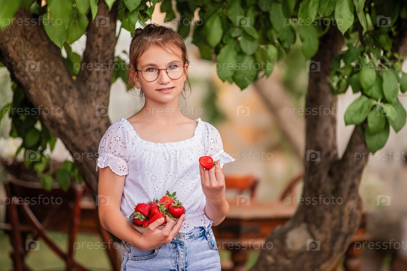 Девушка держит в руке тарелку с клубникой, стоя перед загородным домом