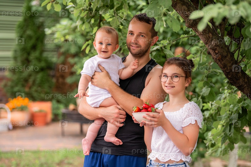Отец и двое детей держат клубнику в летнем саду на даче. Сцена счастливая и радостная