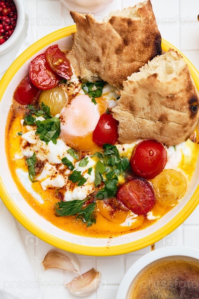 Чилбир или турецкие яйца в белой миске. Яйца-пашот, покрытые пряными греческим йогуртом, затем сбрызнутые оливковым маслом с пряной паприкой и жареными помидорами. Традиционный турецкий завтрак, концепция турецкой кухни