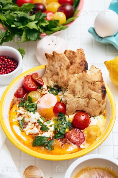 Чилбир или турецкие яйца в белой миске. Яйца-пашот с греческим йогуртом с пряностями, затем сбрызнутые острым оливковым маслом с паприкой и жареными помидорами. Традиционный турецкий завтрак, концепция турецкой кухни