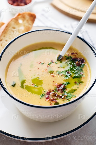 Чаша картофельного супа с петрушкой и беконом с поджаренными хлебными гренками в белой миске. Комфортное питание