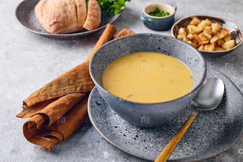 Миска картофельного супа-пюре с гренками, петрушкой и молотым красным перцем и ложкой на тарелку