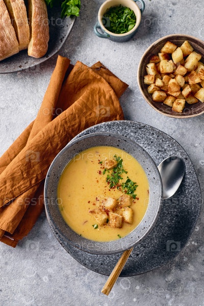 Чаша картофельного супа-пюре с ложкой на тарелке. Миска наполнена желтым супом-пюре и покрыта гренками, петрушкой и молотым красным перцем