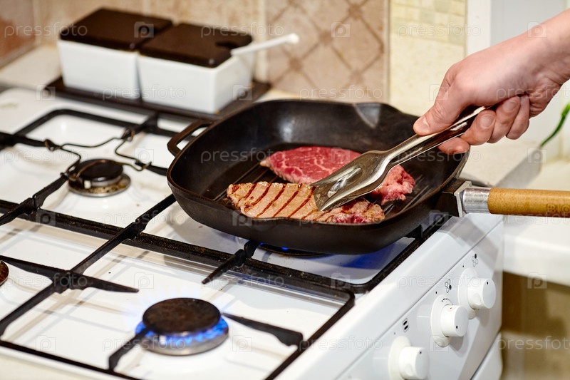 Процесс приготовления двух говяжьих стейков на сковороде, руки шеф-повара-мужчины солят сырое мясо, крупный план
