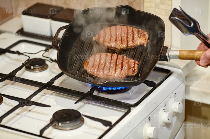 Процесс приготовления двух говяжьих стейков на сковороде, руки шеф-повара-мужчины солят сырое мясо, крупный план