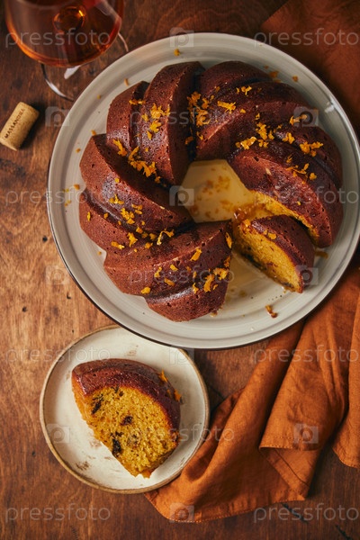 Вкусный домашний тыквенный торт с черносливом и хересом, украшенный глазурью и цедрой на деревянном фоне