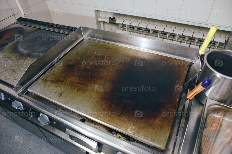 Профессиональная кухонная сковорода из нержавеющей стали для ресторана, горячая жаровая плоскость, серебряная поверхность. Гриль на профессиональной кухне ресторана