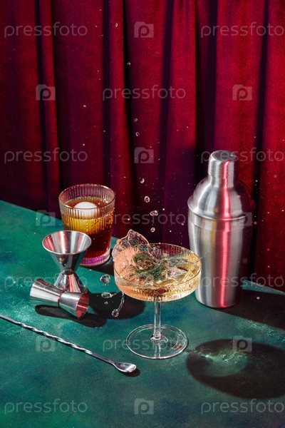 Всплеск в бокал для шампанского, бокал для коктейля, шейкер, ложку для смешивания коктейлей и джиггер на темно-зеленом столе в атмосфере диско-клуба