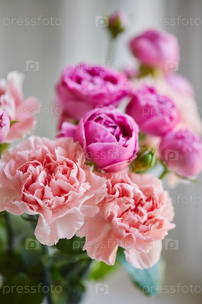 Букет из сиреневых роз и розовых гвоздик. Крупным планом
