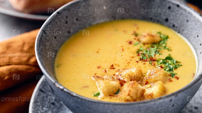 Чаша картофельного супа-пюре с ложкой на тарелке. Миска наполнена желтым супом-пюре и покрыта гренками, петрушкой и молотым красным перцем