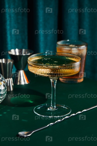 Шампанское в бокале, шейкере, ложке для смешивания коктейлей и джиггере на темно-зеленом столе