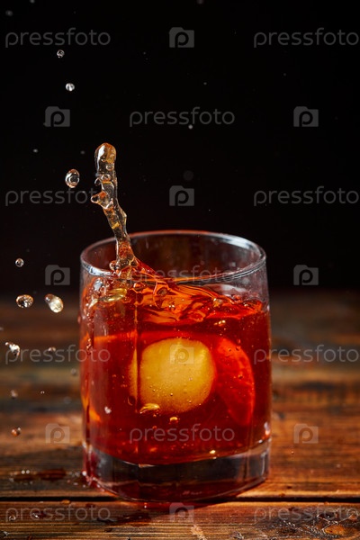 Алкогольный коктейль Негрони или безалкогольный коктейль с брызгами в стакане, напиток со льдом и апельсиновой цедрой в качестве украшения на деревянном столе