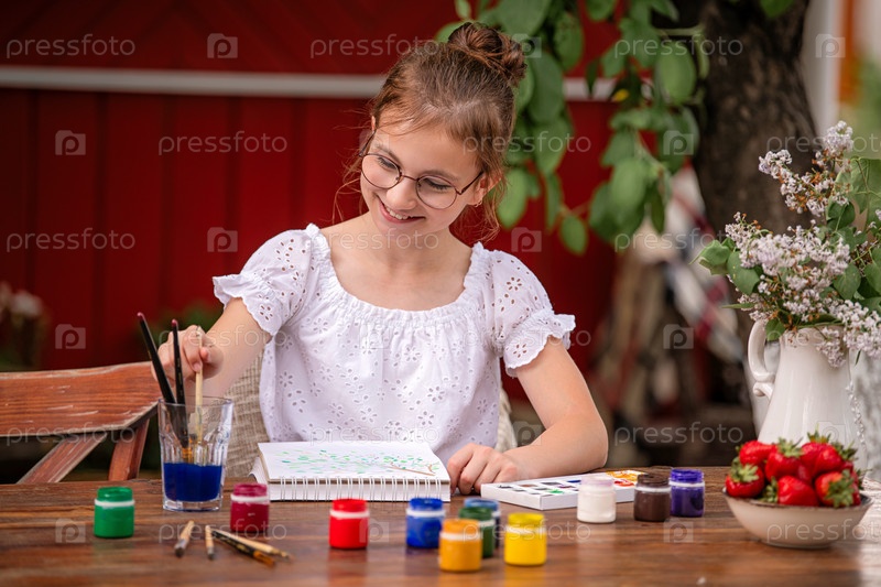 Молодая девушка с радостью участвует в рисовании акварелью на открытом воздухе