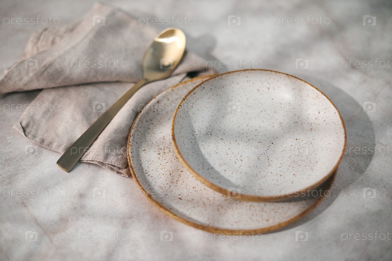 Пустая тарелка, столовые приборы и салфетка на светлом фоне. Сервировка стола на столе. Вид сверху