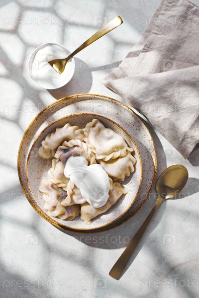 Вареники с вишней со сметаной и сахаром. Традиционное блюдо русской, украинской, белорусской кухни, известное как Вареники