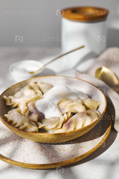 Вареники с вишней со сметаной и сахаром. Традиционное блюдо русской, украинской, белорусской кухни, известное как Вареники