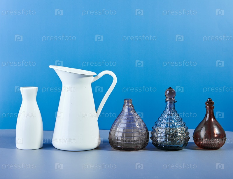 Набор различных приглушенных цветных стеклянных и металлических бутылок, ваз и кувшинов на синем фоне