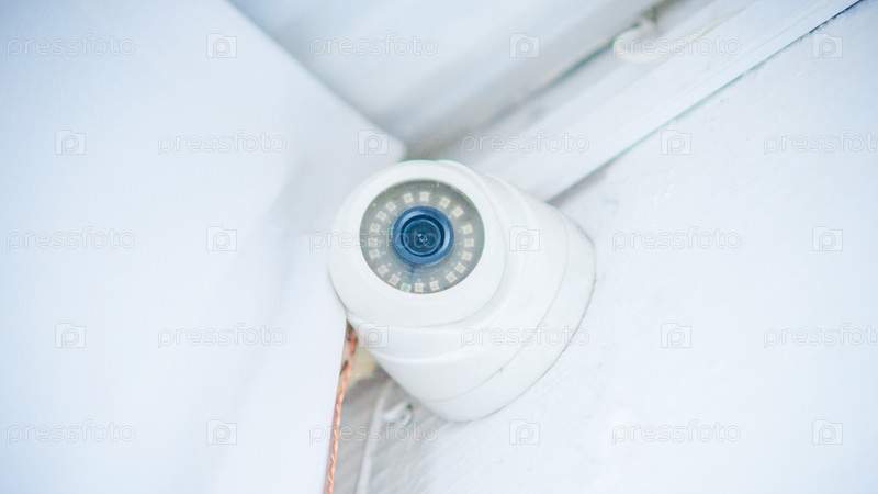 Внутренняя камера видеонаблюдения на белой стене под потолком