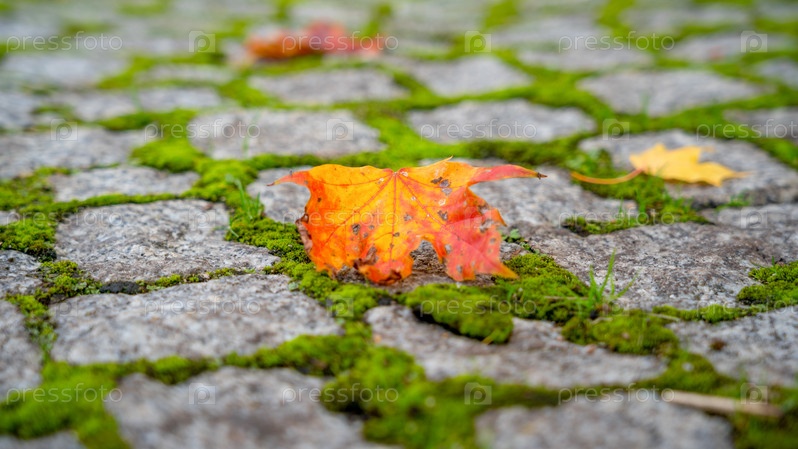 Опавшие желтые листья на тротуаре в парке