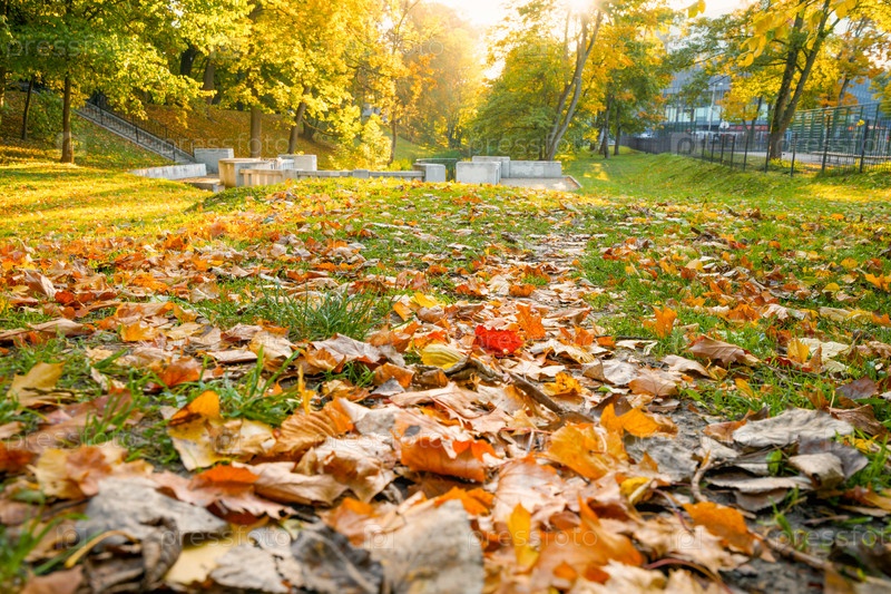 Вид на осенний парк с опавшими желтыми листьями