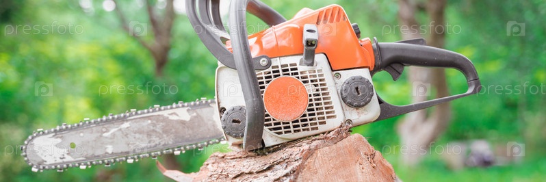Бензопила лежит на распиленных бревнах среди зелени леса, выборочный фокус размыт фон