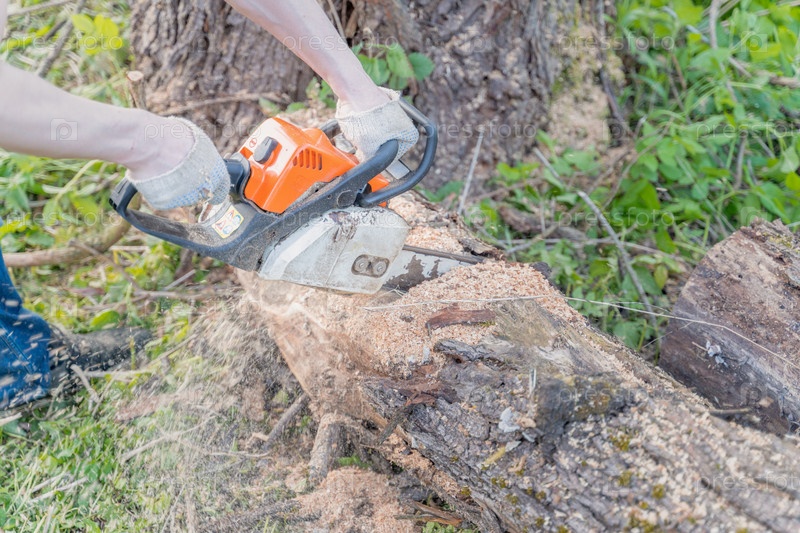 Фермер распиливает дерево бензопилой, избирательный фокус, фокус на переднем плане, размытый фон