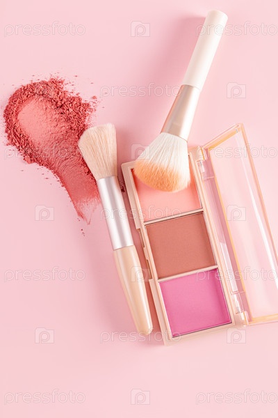 Открытая упаковка разноцветных румян, образец текстуры румян и две кисти для макияжа на розовом вертикальном фоне. вид сверху