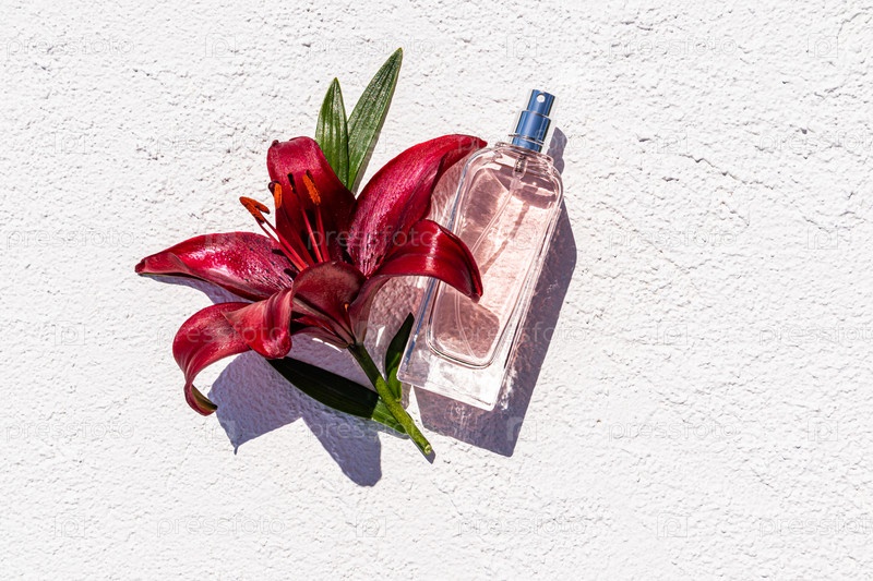 Шикарный флакон косметического спрея или духов на рельефном белом фоне с прекрасным цветком садовой лилии насыщенного цвета. вид сверху