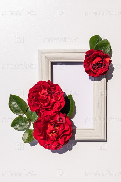 Красивая фоторамка с цветущей красной розой и пустым местом для текста. вертикальный белый фон. цветочная рамка. макет для дизайна