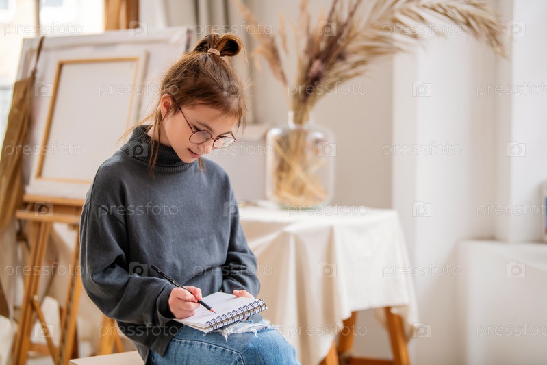 Девушка рисует ручкой в блокноте в художественной студии с белым столом и вазой с засушенными цветами. В комнате царит спокойная и умиротворяющая атмосфера