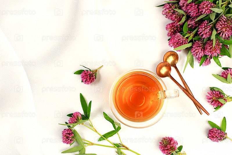 Лекарственный травяной чай или настой красного клевера в стеклянной чашке с цветами, концепция альтернативной традиционной медицины, источник эстрогена, средство от менопаузы, реклама зеленой аптеки,