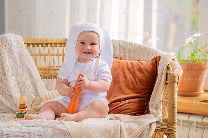 Ребенок в белой шапочке с кроличьими ушками сидит на диване с морковкой в руке. Сцена игривая и беззаботная: ребенок держит морковку, как игрушку