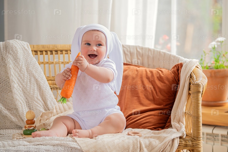 Ребенок в белой шапочке с кроличьими ушками сидит на диване с морковкой в руке. Сцена игровая и беззаботная: ребенок держит морковку, как игрушку