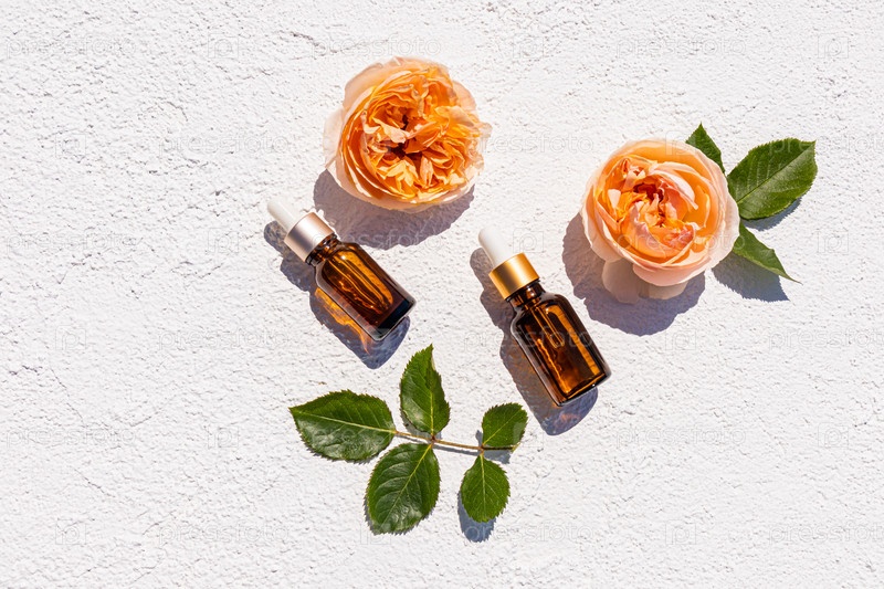 Натуральный косметический продукт в двух флаконах из янтарного стекла с капельницей на белом рельефном фоне с желтым ярким цветком чайной розы. Уход, красота