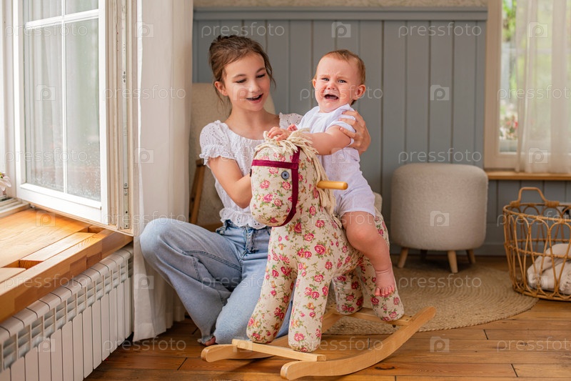 Старшая сестра успокаивает плачущего ребенка на лошадке-качалке в интерьере детской комнаты