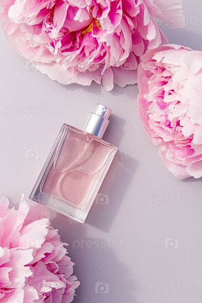 Красивый флакон косметического спрея или духов на светлом фоне среди свежих шикарных пионов. Макет пустой бутылки. вид сверху. Компоновка продукта