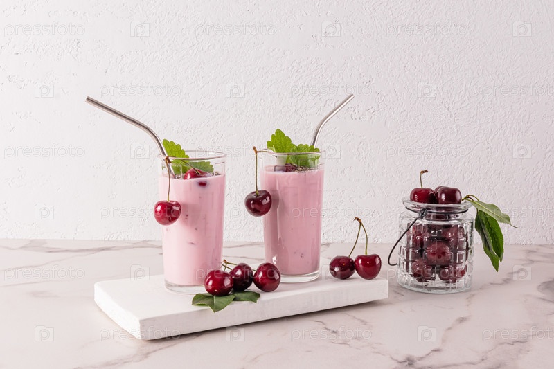 Два стакана свежеприготовленного вишневого смузи на деревянной подставке среди спелой вишни на мраморном столе. Вкусный здоровый завтрак, детокс