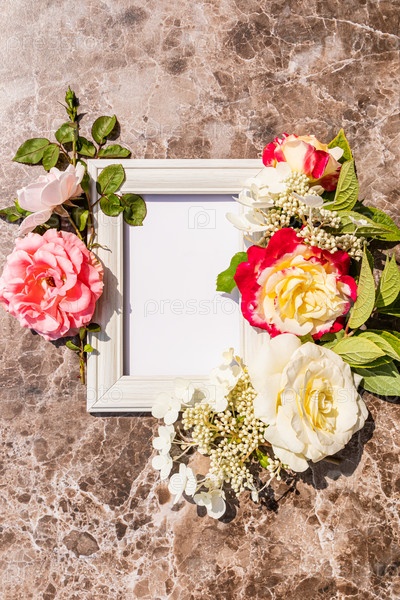 Красивая цветочная композиция с розами и фоторамкой на коричневом мраморном фоне. Пустое место для текста. вид сверху. плоская планировка